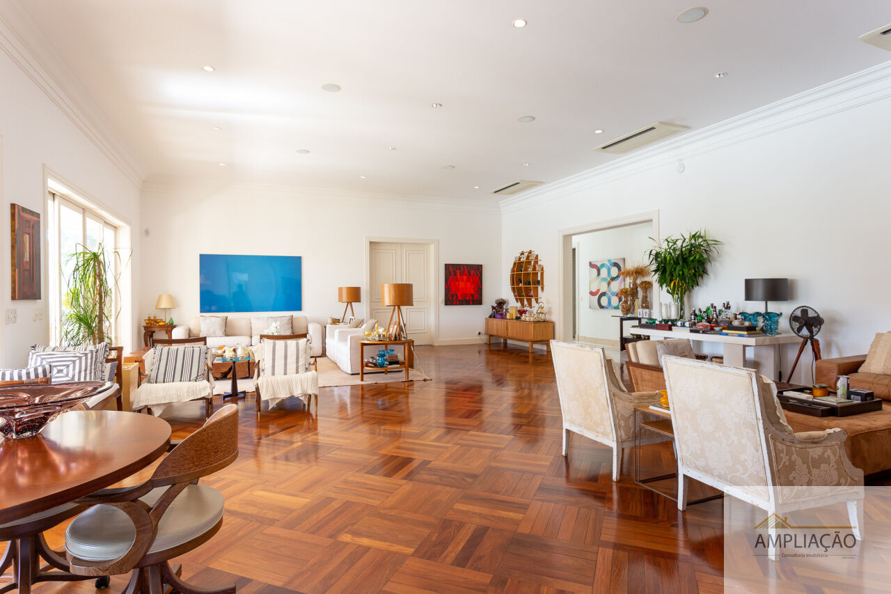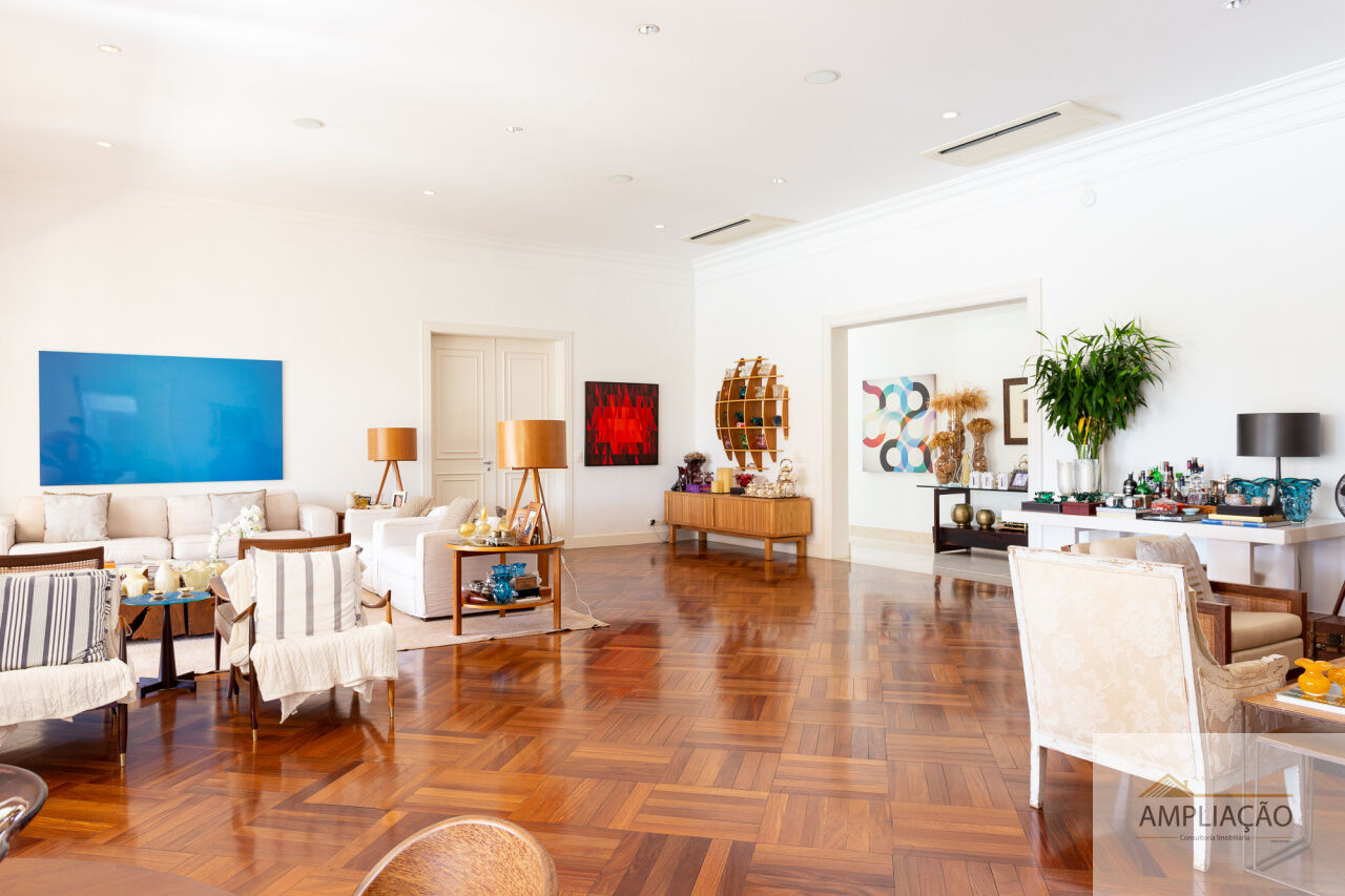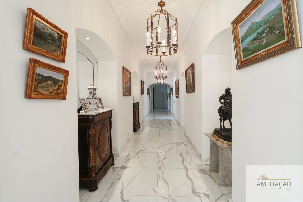 O hall imponente em mármore dá as boas-vindas e conecta os principais ambientes: living para vários ambientes, sala de jantar, sala de estar e sala de TV, todos integrados e com ótima iluminação natural. Dois lavabos oferecem conveniência extra, e o elevador garante total acessibilidade.