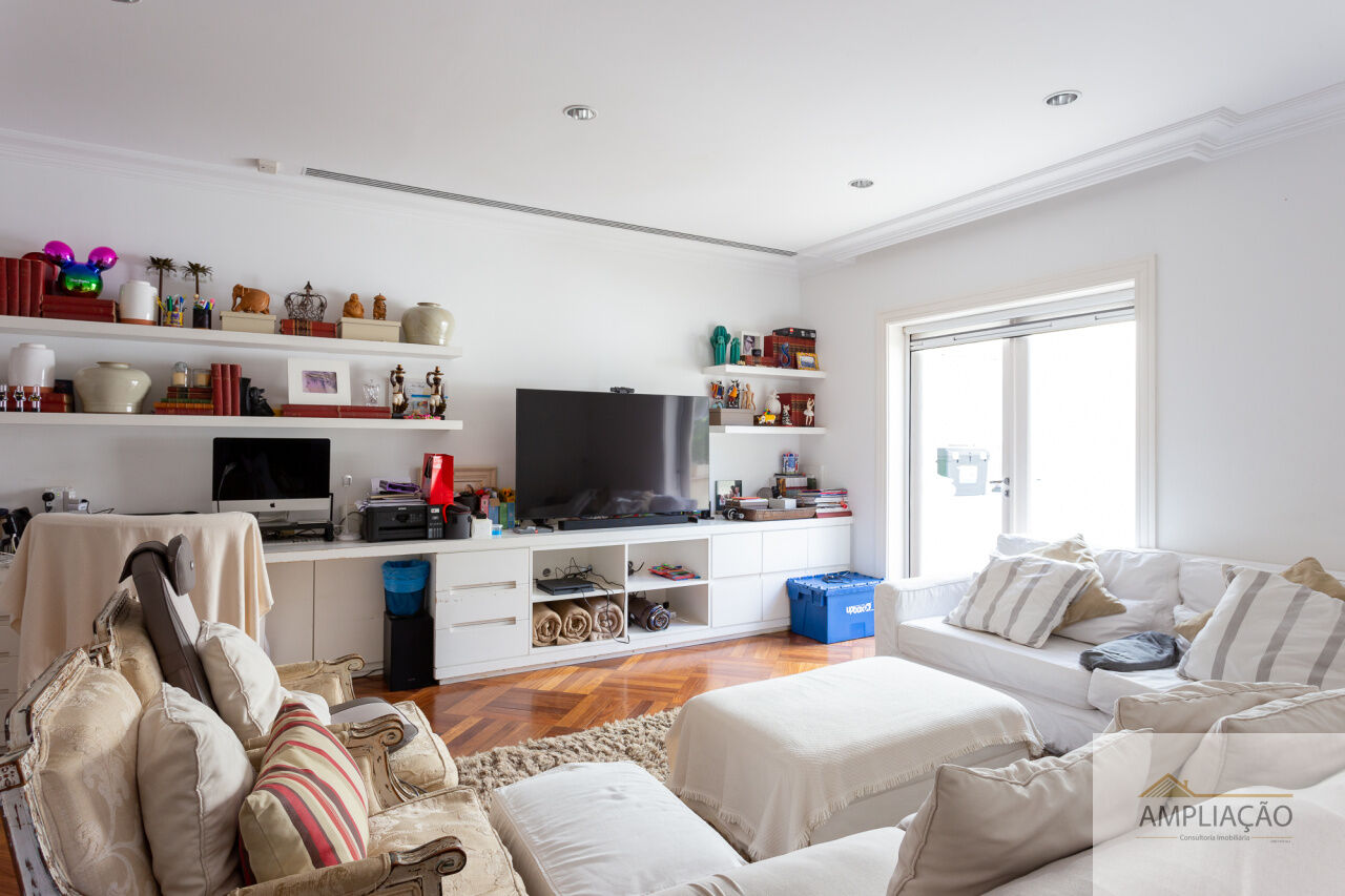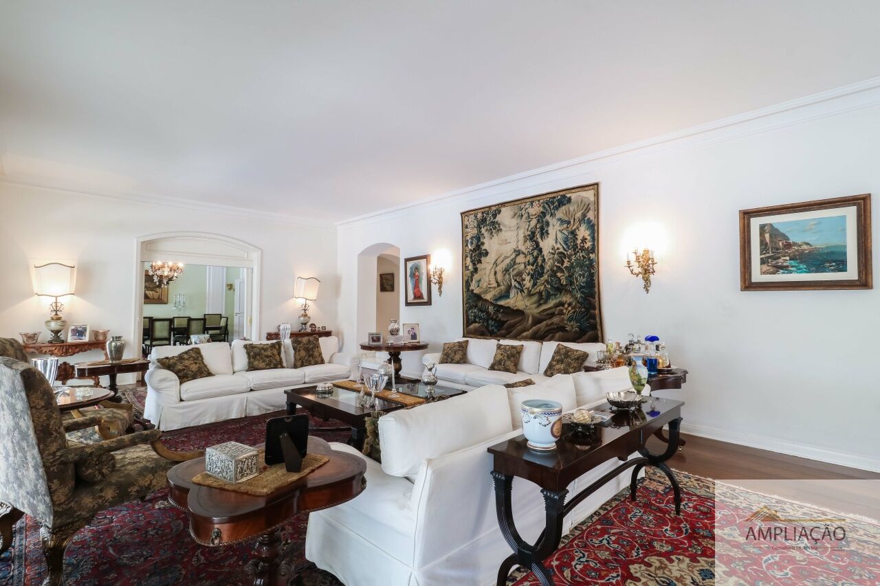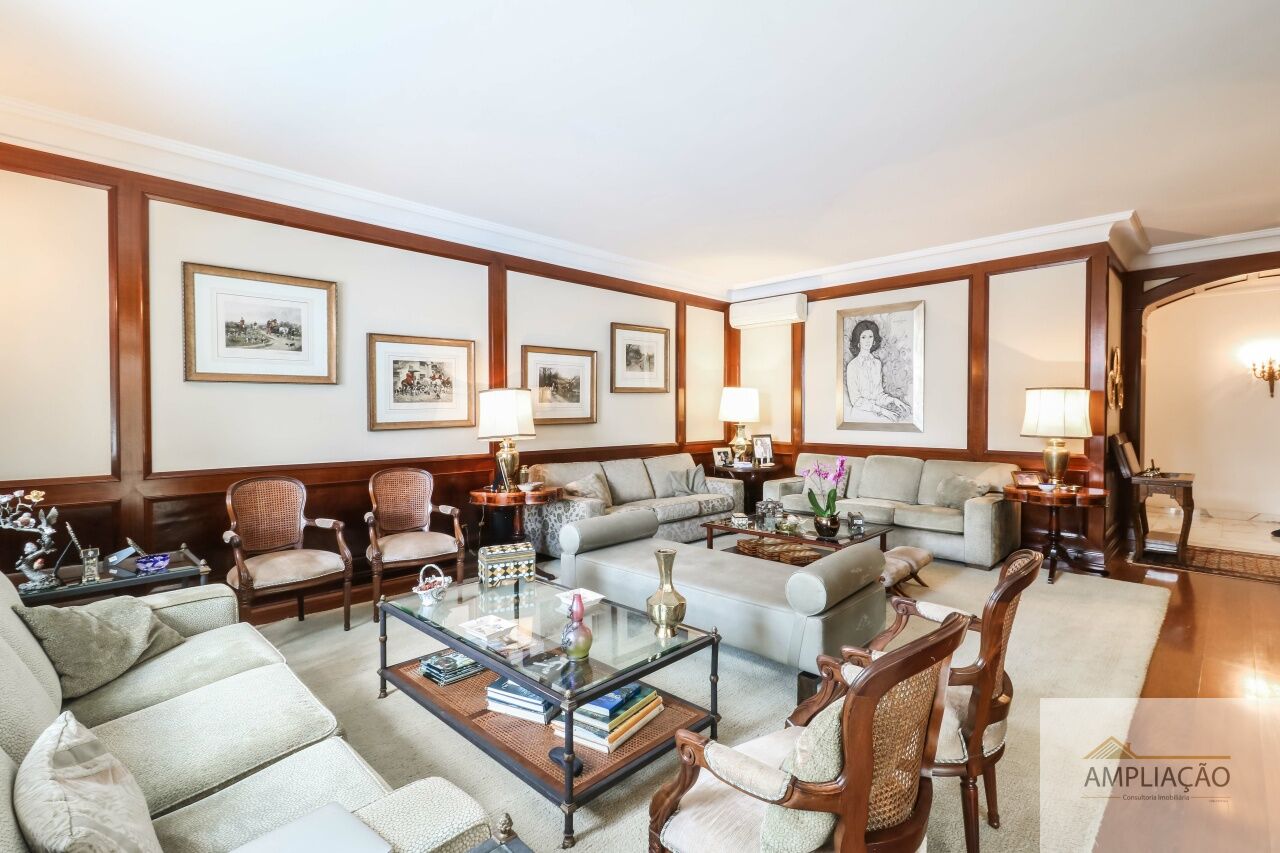 O hall imponente em mármore dá as boas-vindas e conecta os principais ambientes: living para vários ambientes, sala de jantar, sala de estar e sala de TV, todos integrados e com ótima iluminação natural. Dois lavabos oferecem conveniência extra, e o elevador garante total acessibilidade.