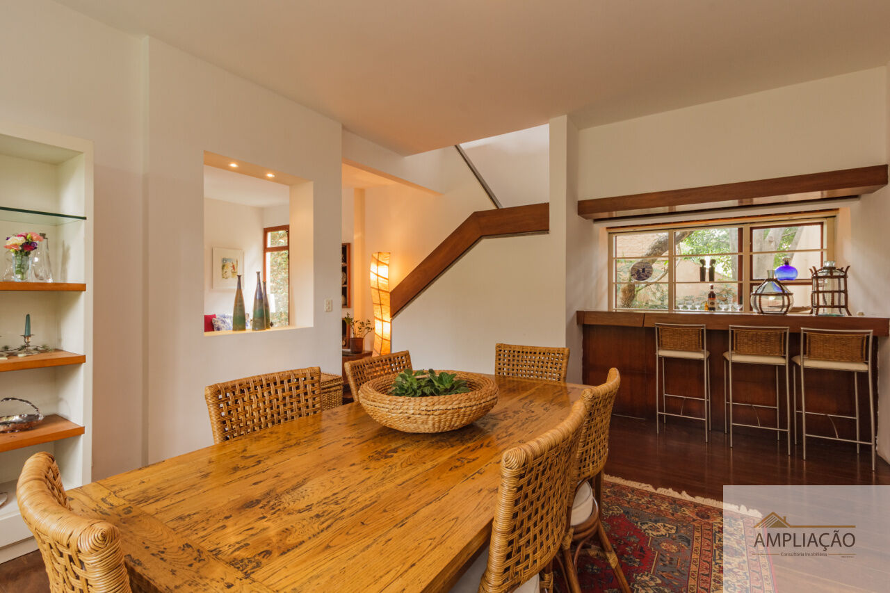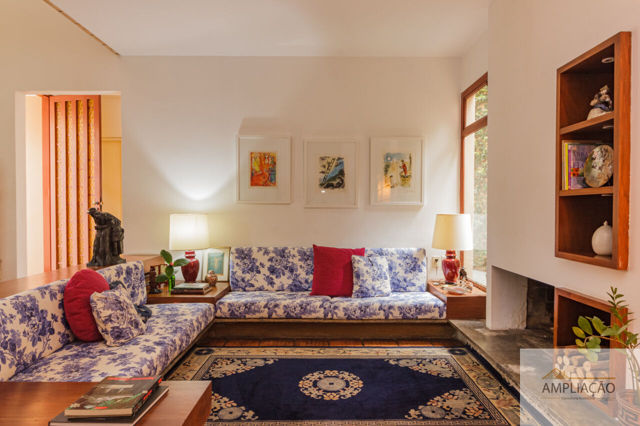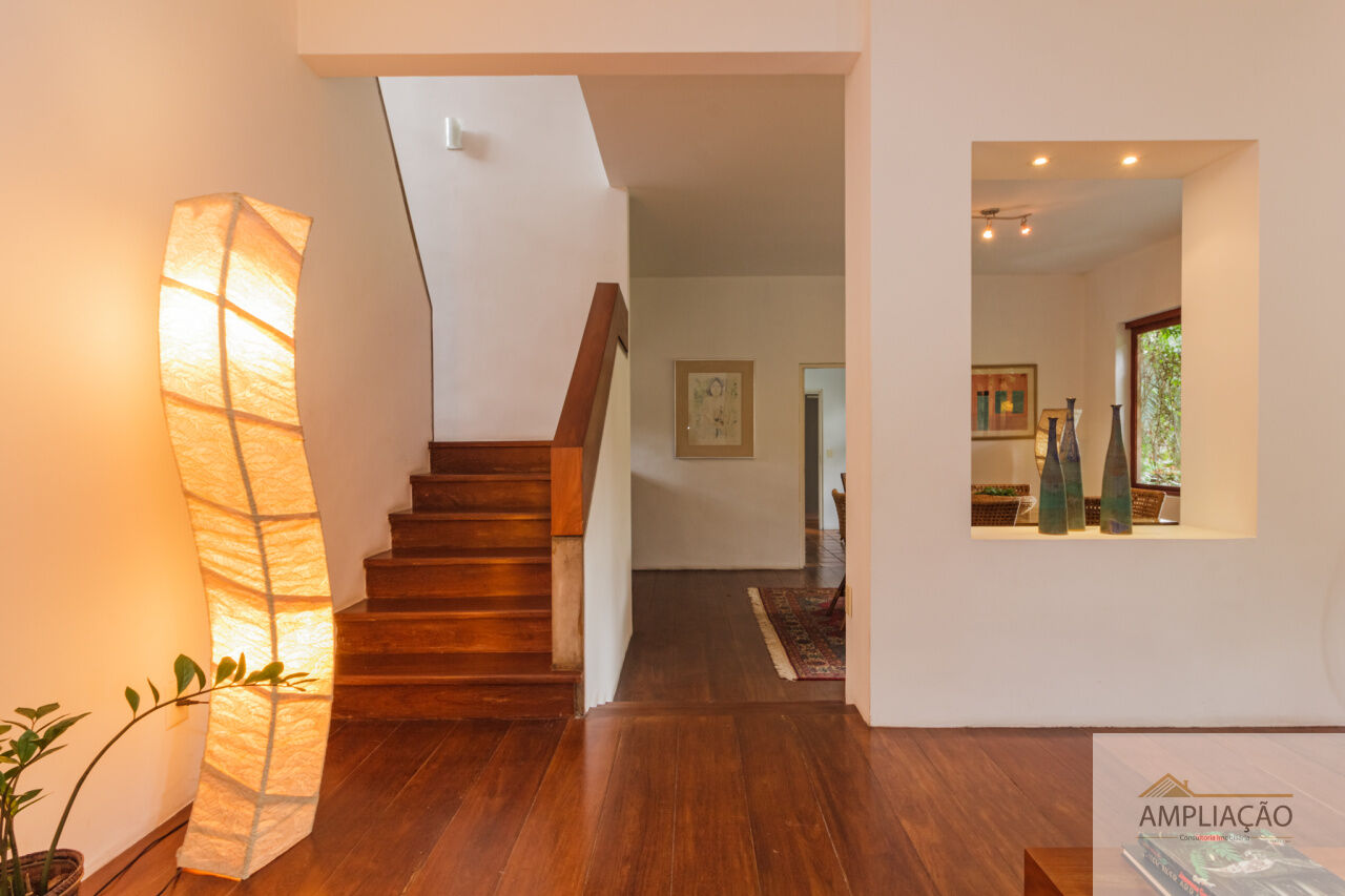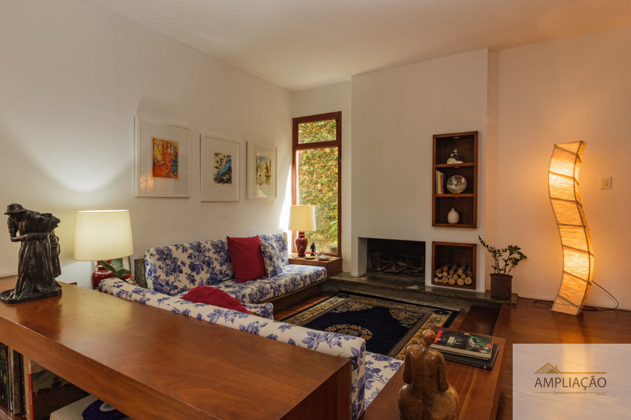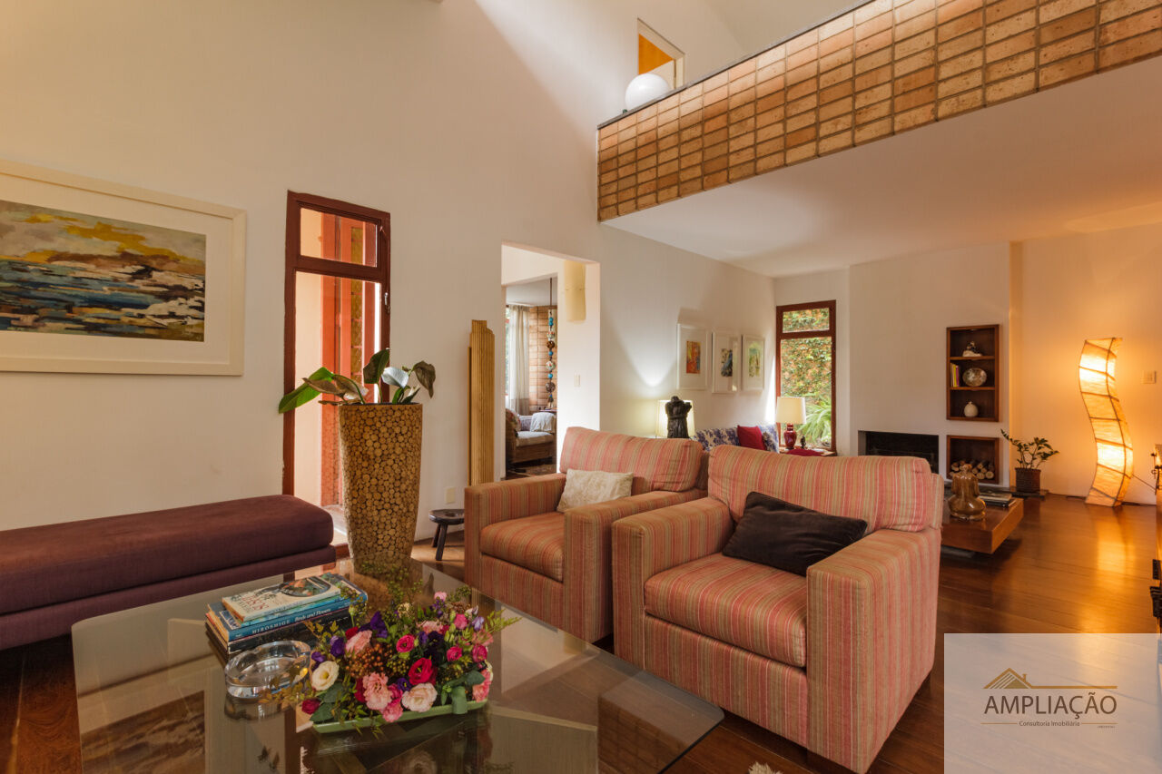 O living com pé-direito duplo se integra à sala de estar com piso de madeira, sala de TV, sala com lareira, sala de jantar e sala de almoço, além de copa e cozinha. Na área íntima, uma antessala distribui os quatro dormitórios ? sendo duas suítes, incluindo a máster com closet, ar-condicionado e terraço.